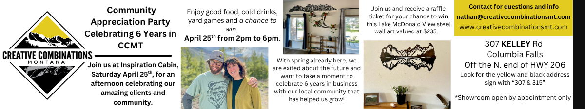 Join us, Nate and Kelsey, as we celebrate 6 years in business! Open house style with a community appreciation party at our showroom and Airbnb space Inspiration Cabin. We are so grateful to our wonderful local community that has supported us and helped us grow over the last 6 years and wanted to take a moment to say thank you. April 25th Kelsey and I will at Inspiration Cabin ready to hang out with you. Swing by any time between 2pm and 6pm, and enjoy drinks, and Kelsey’s famous Elk meet balls. Weather permitting, we will have yard games and have a chance to win one of our Lake McDonald View 36" steel wall art pieces. Visit our website for more details. Email or call with questions. Hope to see you there!