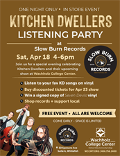 Join us for a special afternoon celebrating the Kitchen Dwellers and their upcoming show at the Wachholz College Center. We'll be spinning Kitchen Dwellers vinyl, and Wachholz staff will be selling discounted tickets for the show on April 23. There'll also be a raffle for a signed copy of the band's Seven Devils album!