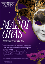 Celebrate Mardi Gras at Tupelo Grille. Food, drink and live music featuring the Beignet Boys. Music starts at 6:30PM.