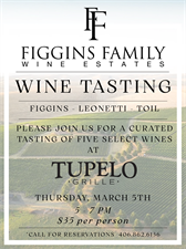Wine Tasting at Tupelo Grille Figgins Family Wine Estates. Pacific Northwest wines, Figgins, Leonetti & Toil. Wine Tasting at Tupelo Grille Set a Reminder Enter your email address below to receive a reminder message. Email address Select the amount of Days before the event -- Select Days Before Event -- 1 Day 2 Days 3 Days 1 Week Captcha Validation Please complete the Captcha Submit Date and Time Thursday Mar 5, 2026 5:00 PM - 7:00 PM MST Thursday March 5th Location Tupelo Grille 17 Central Ave Fees/Admission $35 Set a Reminder Enter your email address below to receive a reminder message. Email address Select the amount of Days before the event -- Select Days Before Event -- 1 Day 2 Days 3 Days 1 Week Captcha Validation Please complete the Captcha Submit Share × Print Email Add to Calendar Facebook Twitter LinkedIn Tell a Friend × Select Calendar Type × Google Yahoo iCal (Outlook, Apple, or other)